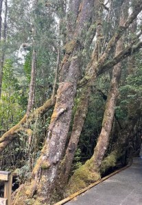 We filed off the ship and entered an ancient realm. Trees soared toward the sky, so tall I could hardly see their tops. ‘Huon Pines have been known to live up to 3000 years,’ said our guide, ‘and there is a known stand who’s root base has been in existence for 10,000 years. As you go along you will pass a 2000-year-old pine. That is, it was growing before Christ was born.’ I tried to get my head around that but gave it away. ‘It has fallen but its roots are still alive and so saplings are growing from it.’