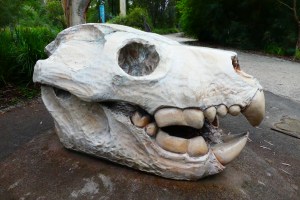 This skull is a scaled up replica of a Thylacoleo, a Marsupial Lion, which roamed across Australia over 40,000 years ago. It was a ferocious Pleistocene killer, possibly taking down prey like the Diprotadon, a animal about the size of a small rhino.